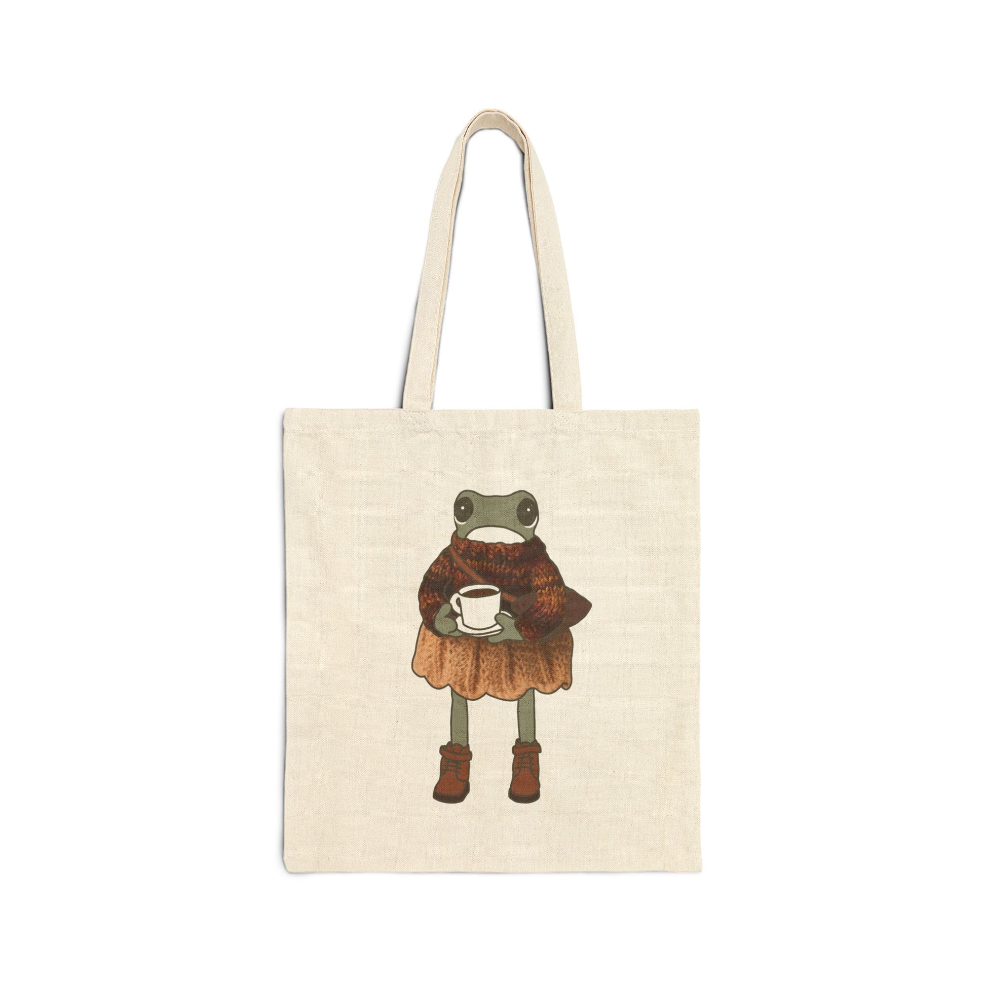 This sturdy cotton canvas tote carries a quiet, whimsical charm—an earthy beige bag printed with a hand-drawn frog wearing a striped sweater and trousers. It feels like a slow morning walk by the pond: soft canvas under your arm, a little illustration that sparks a smile, and enough heft to hold groceries, sketchbooks, or a market haul. The flat-corner construction keeps the silhouette clean and slim, while reinforced, self-fabric handles stand up to daily use. Choose natural for a warm, organic look or black for higher-contrast style. It’s the kind of everyday carry that quietly announces your eye for simple, story-rich pieces and lasts through seasons of outings and errands.